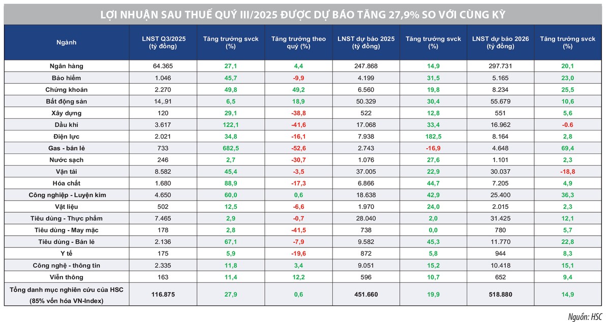 Một số ngân hàng thương mại cổ phần tư nhân có thể đạt mức tăng trưởng vượt trung bình. Nếu kết quả quý III sát với kỳ vọng, ngành ngân hàng có thể trở lại vai trò dẫn dắt VN-Index trong 3 tháng cuối năm. Ngắn hạn, nhóm cổ phiếu ngân hàng vẫn là điểm tựa tâm lý của thị trường.