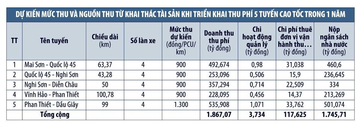 Tính đến nay, có 13 tuyến đường cao tốc đã triển khai thu phí, với mức thu bình quân 1.713 đồng/xe tiêu chuẩn-PCU/km. Nguồn thu được sử dụng cho công tác quản lý, vận hành thu phí và hoàn vốn đầu tư các dự án.