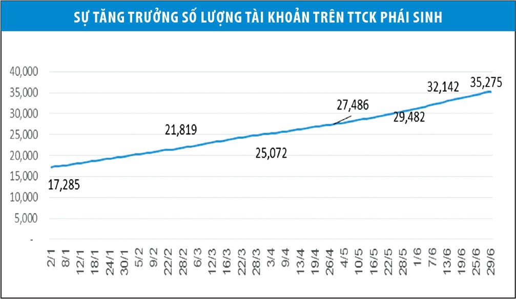 Thống kê của Trung tâm Lưu ký chứng khoán cho biết, số lượng tài khoản giao dịch phái sinh liên tục được mở, trung bình mỗi ngày có 150 tài khoản mới. Tính đến hết tháng 6/2018, đã có 35.275 tài khoản giao dịch phái sinh được mở, gấp 2 lần so với thời điểm cuối năm 2017.