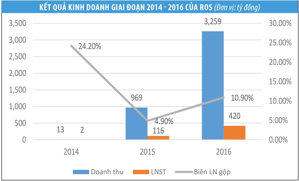 Năm 2016, ROS công bố tổng tài sản của Công ty tăng 81%, từ 4.522 tỷ đồng lên 8.192 tỷ đồng; vốn chủ sở hữu tăng 56%%, từ 3.149 tỷ đồng lên 4.928 tỷ đồng; doanh thu và lợi nhuận gấp lần lượt 3,64 lần và 3,61 lần năm 2015 và hoàn thành vượt mức kế hoạch. Kết quả kinh doanh năm 2016 tăng trưởng mạnh, nhưng do ROS tăng vốn cổ phần trong năm nên lãi trên mỗi cổ phiếu (EPS) giảm xuống 1.014 đồng so với mức 1.398 đồng của năm 2015.