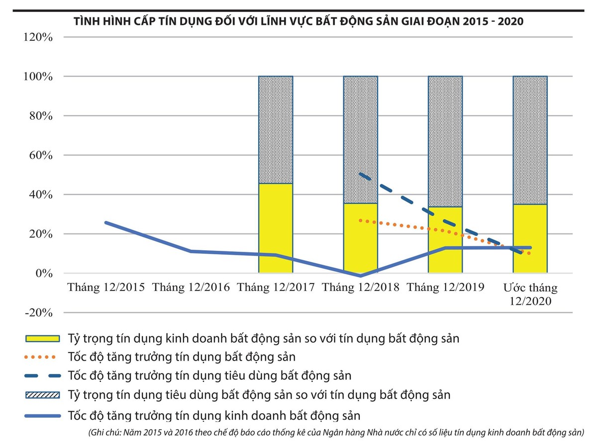 Về tỷ trọng, tín dụng kinh doanh bất động sản chiếm tỷ trọng 35% trên tổng dư nợ tín dụng lĩnh vực bất động sản. Tỷ trọng này mặc dù tăng nhẹ so với cùng kỳ năm 2019 với con số 33,74%, nhưng đã giảm mạnh so với năm 2017 là 45,63% và 2018 là 35,49%. Tín dụng tiêu dùng/tự sử dụng bất động sản chiếm tỷ trọng 65% tín dụng bất động sản, giảm nhẹ so với cùng kỳ năm 2019 với con số là 66%, nhưng nhìn chung có xu hướng tăng khi tỷ trọng trong năm 2017 là 54,37% và năm 2018 là 64,51%.
