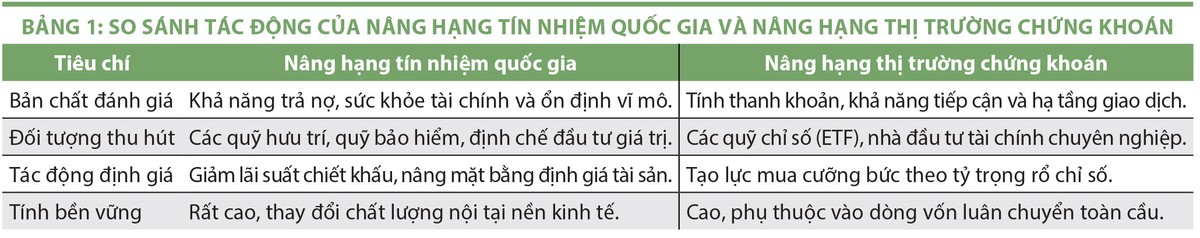 Cần phân biệt rõ tác động của việc nâng hạng tín nhiệm quốc gia với việc nâng hạng thị trường chứng khoán (từ Cận biên lên Mới nổi) để thấy rõ ý nghĩa nền tảng của sự kiện này (xem Bảng 1).