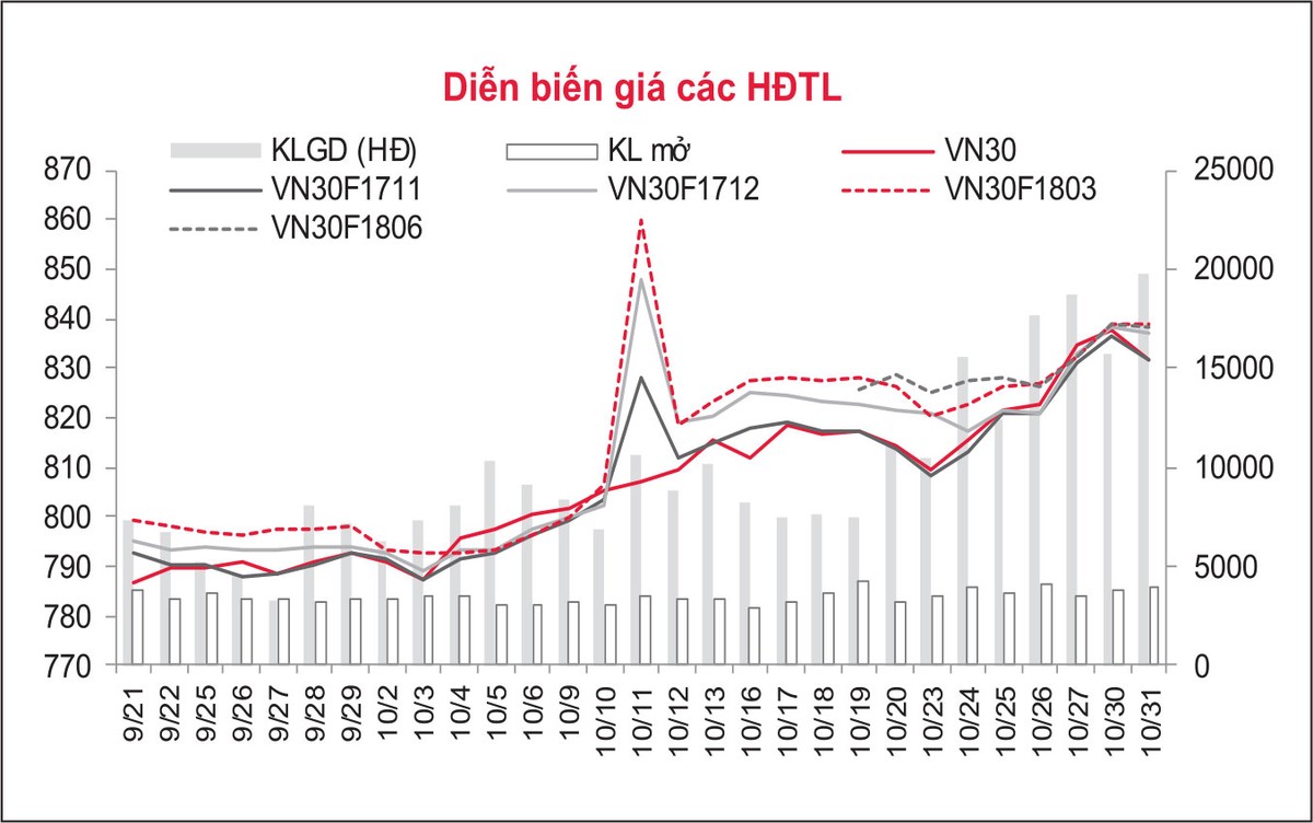 Tháng 10/2017, hợp đồng tương lai chỉ số VN30 đã có 2 phiên giao dịch với thanh khoản tăng rất mạnh, cụ thể vào ngày 27/10 (18.567 hợp đồng) và 31/10 (19.633 hợp đồng). Tuy nhiên, theo Công ty Chứng khoán TP.HCM (HSC), khối lượng hợp đồng mở (O/I) không tăng tương ứng, điều đó cho thấy dòng tiền mới tham gia thị trường là chưa nhiều.