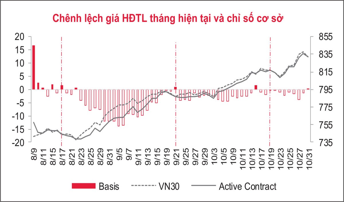 Hợp đồng xa hơn, hợp đồng tương lai tháng 11 trở thành hợp đồng đáo hạn gần nhất sau khi hợp đồng tương lai tháng 10 đáo hạn. Điều đó giúp O/I và cả khối lượng giao dịch tăng nhanh khi hợp đồng tương lai tháng 10 đáo hạn.