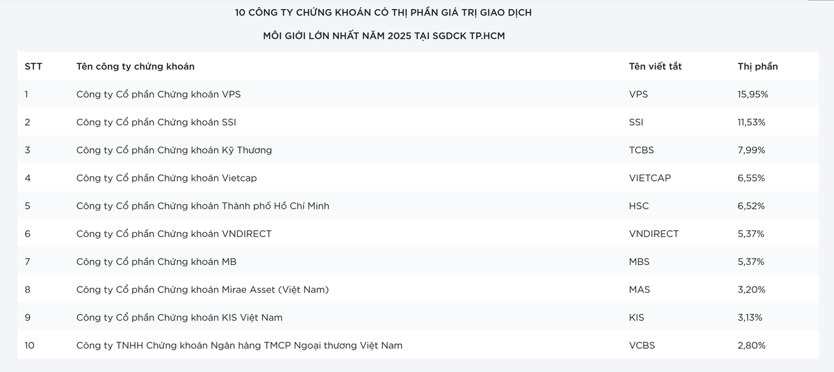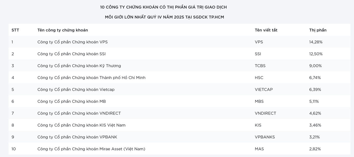 Cho cả năm 2025, VPS giữ vị trí dẫn đầu nhưng thị phần sụt giảm còn 15,95% so với mức 18,26% năm 2024.