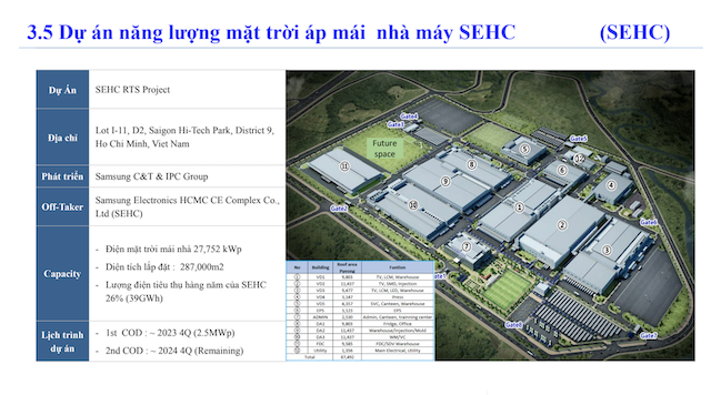 Đặc biệt, hệ thống điện mặt trời mái nhà đang được triển khai tại Nhà máy Samsung Electronics TP.HCM với kế hoạch quý IV/2023 sẽ đưa vào vận hành giai đoạn 1 công suất 2,5 MWp.
