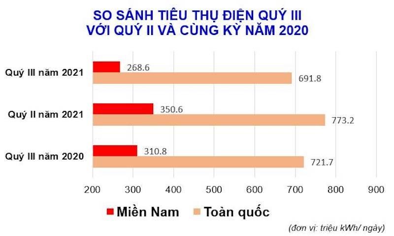 Nếu so sánh sản lượng tiêu thụ điện trung bình ngày trên quy mô toàn quốc, mức tiêu thụ điện của quý III/2021 giảm 10,53% so với quý II/2021 và giảm 4,14% so với cùng kỳ quý III/2020. Đồng thời, nếu so sánh sản lượng tiêu thụ điện trung bình ngày của riêng khu vực miền Nam thì mức tiêu thụ điện của quý III/2021 giảm 23,41% so với quý II/2021 và giảm 13,59% so với cùng kỳ quý III/2020.