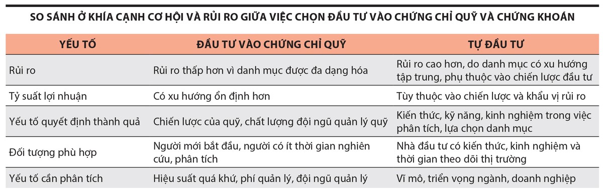Cũng theo nhà đầu tư Mai Hương, việc chuyển một phần nguồn vốn vào kênh đầu tư chứng chỉ quỹ không có nghĩa là chị không tự đầu tư chứng khoán, nhưng việc chia đều các khoản đầu tư cũng giúp chị cân bằng giữa cơ hội và rủi ro. Việc lựa chọn đầu tư vào chứng chỉ quỹ hay mua trực tiếp chứng khoán trên sàn giao dịch, theo chị Hương, phụ thuộc vào trình độ hiểu biết về thị trường, kinh nghiệm đầu tư, thời gian, khẩu vị chấp nhận rủi ro của từng nhà đầu tư.
