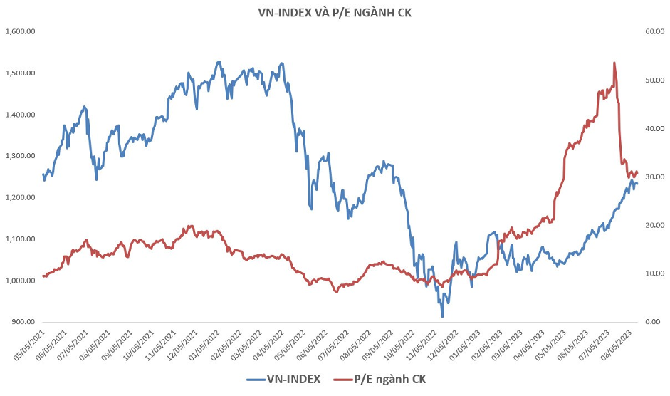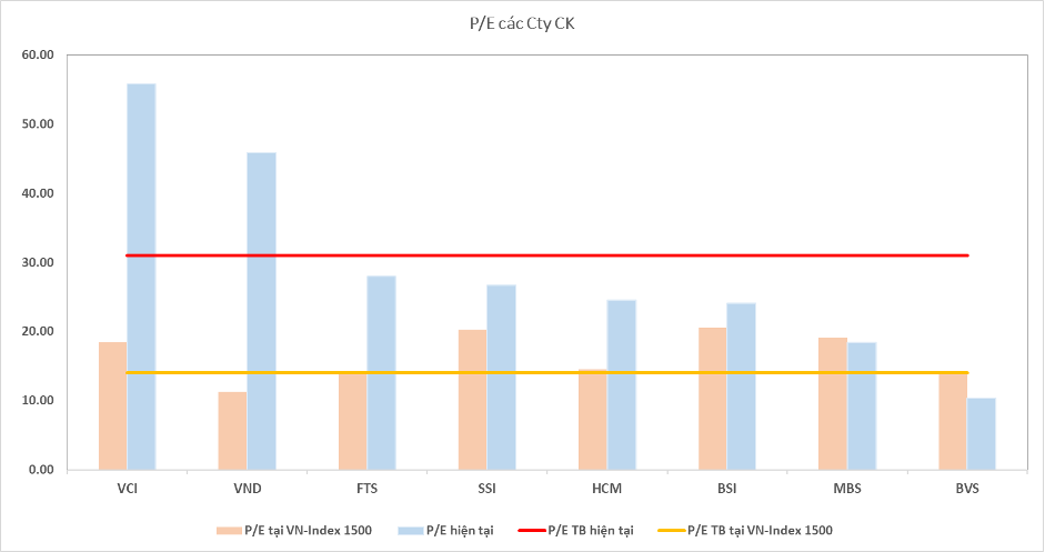 Tuy nhiên, nếu dùng chỉ số PE để xem xét động lực tăng trưởng thì sẽ có một bức tranh hoàn toàn khác hẳn. PE của ngành chứng khoán trong giai đoạn VN-Index 1.500 điểm là khoảng 15, thì hiện này, con số này là gấp 2 (gần 30), mặc dù VN-Index hiện nay đang ở mốc 1.190 điểm. Đây là lý do khiến cho nhiều nhà đầu tư “chùng tay” và kỳ vọng giá cổ phiếu sẽ được điều chỉnh ở mức hợp lý hơn. Do vậy, vẫn có thể tìm cơ hội ở cổ phiếu chứng khoán nhưng nhà đầu tư cũng cần tỉnh táo trong mỗi con sóng để có hành động giao dịch thích hợp.