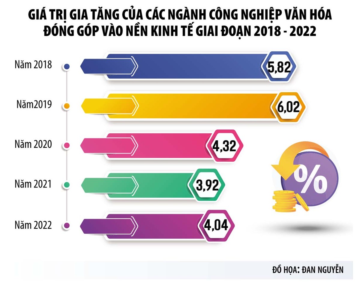 Theo báo cáo của Bộ Văn hóa, Thể thao và Du lịch tại hội nghị này, giá trị sản xuất của các ngành công nghiệp văn hóa Việt Nam giai đoạn 2018 - 2022 đạt 1,059 triệu tỷ đồng (khoảng 44 tỷ USD). Trong đó, giá trị tăng thêm của các ngành công nghiệp văn hóa đóng góp vào nền kinh tế năm 2018 đạt 5,82%; năm 2019 đạt 6,02%; năm 2020 và 2021, do ảnh hưởng của Covid-19, nên có sự sụt giảm, còn khoảng 4,32% và 3,92%. Đến năm 2022, các ngành bắt đầu phục hồi, giá trị đóng góp gia tăng, đạt khoảng 4,04%.