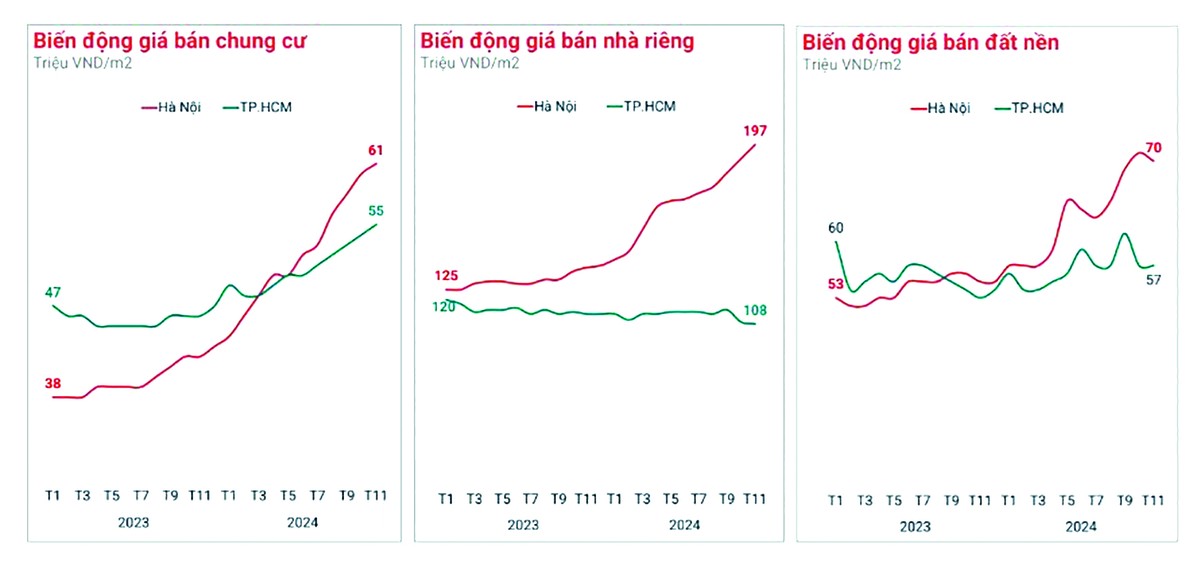 Cùng với đó, giá bất động sản tiếp tục duy trì đà tăng, đặc biệt ở phân khúc căn hộ và có dấu hiệu lan tỏa sang các phân khúc khác. Tại Hà Nội, căn hộ hạng A ghi nhận mức tăng giá mạnh nhất, từ 20-35% so với cùng kỳ năm 2023, còn tại TP.HCM có mức tăng nhẹ hơn, từ 15-20%.