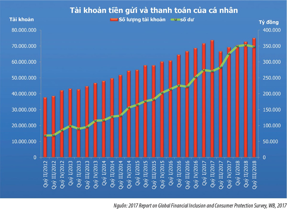 Do đó, theo số liệu WB năm 2014, so với các nước có cùng mức thu nhập bình quân đầu người, Việt Nam vẫn có tỷ lệ người có tài khoản tại tổ chức tín dụng ở mức thấp hơn (31%), đặc biệt ở vùng nông thôn (chỉ 27%). Theo báo cáo cạnh tranh toàn cầu 2014 - 2015 của Diễn đàn Kinh tế Thế giới (WEF), chỉ số mức độ sẵn có về dịch vụ tài chính của Việt Nam là 3,9 (thang điểm cao nhất là 7 và trung vị là 4,5), đứng thứ 104/144 nước được xếp hạng.