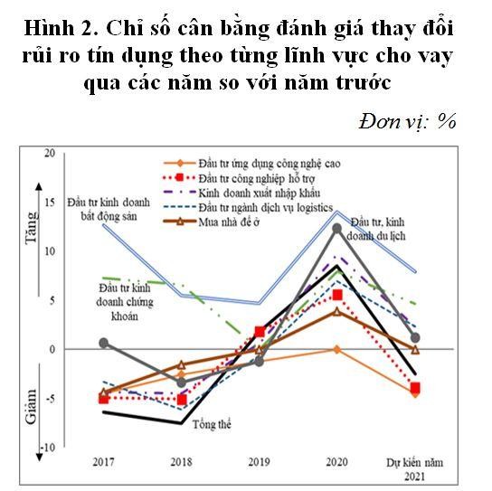 Rủi ro tín dụng tổng thể được các tổ chức tín dụng nhận định có dấu hiệu “tăng” trong năm 2020 so với năm 2019, trong đó rủi ro của các khoản vay kinh doanh bất động sản được nhận định “tăng” cao nhất, rủi ro của các khoản vay ngắn hạn được nhận định tăng cao hơn các khoản vay trung, dài hạn. Các tổ chức tín dụng kỳ vọng rủi ro tín dụng giảm nhẹ trong năm 2021 so với năm 2020.