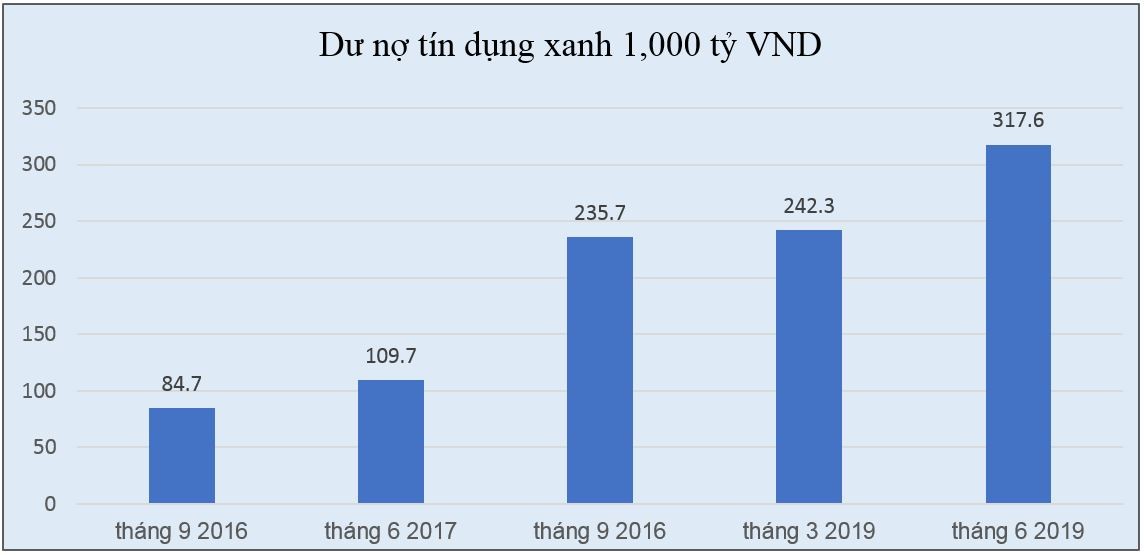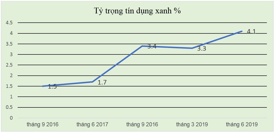 Với các nỗ lực chung, đến nay nền tảng pháp lý, thể chế, chính sách cho ngân hàng-tín dụng xanh về cơ bản đã hình thành. Dư nợ tín dụng xanh qua thống kê chưa đầy đủ đến tháng 6/2019 đã tăng rất nhanh lên đến 317.600 tỷ đồng. Tỷ trọng tín dụng xanh cũng tăng mạnh từ 1,5% lên 4,1% tổng dư nợ toàn nền kinh tế (xem đồ thị minh họa).