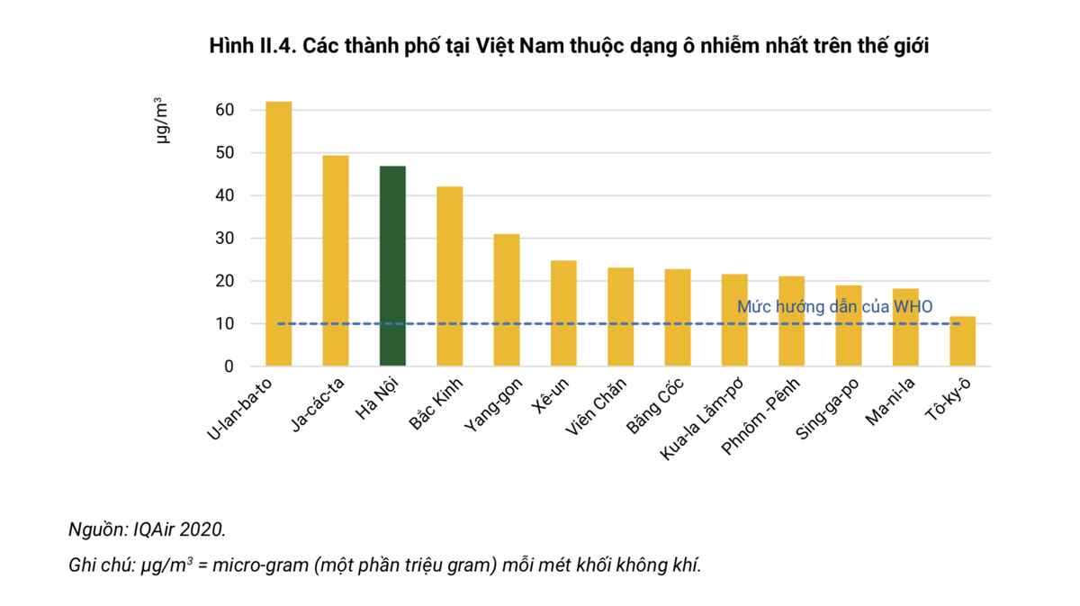 Cũng theo Ngân hàng Thế giới, nếu gộp lại toàn bộ những tổn hại về môi trường, thiệt hại ước tính ở mức từ 4 đến 8% GDP mỗi năm, do tác động tiêu cực trực tiếp đến vốn tự nhiên và ngoại ứng gián tiếp đến năng suất lao động, cũng như chất lượng của cơ sở hạ tầng.