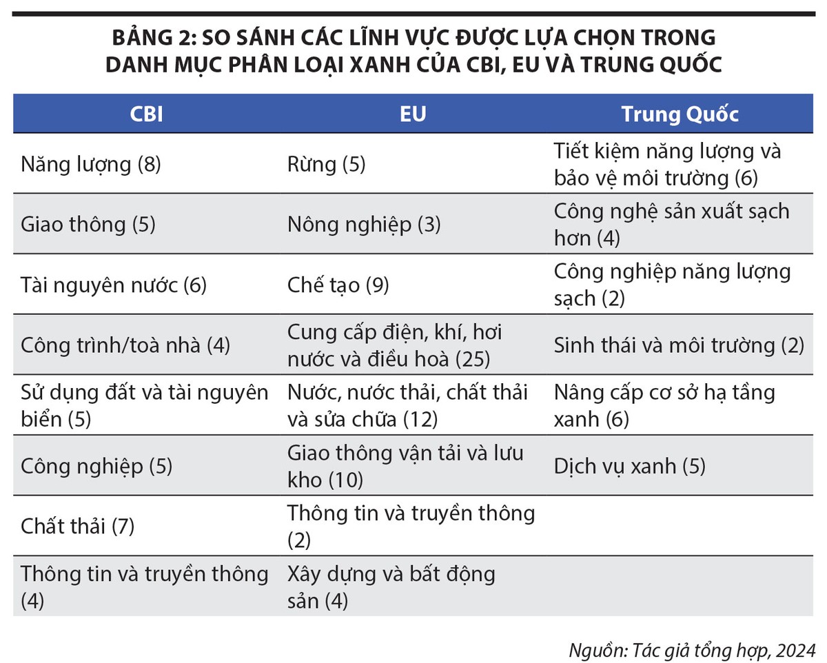 Về cấu trúc, một danh mục phân loại xanh thường bao gồm các nhóm ngành chính, các tiểu ngành và các tiêu chí môi trường để xác định một dự án hay hoạt động kinh tế thuộc ngành và tiểu ngành đó là “xanh”, đóng góp vào việc đạt được các mục tiêu bảo vệ môi trường quốc gia. Các ngành/nhóm ngành có thể bắt nguồn từ các phân loại ngành hiện có như hệ thống phân ngành kinh tế quốc tế của Liên hợp quốc (ISIC), hoặc hệ thống phân ngành của mỗi quốc gia, khu vực. Trong đó, áp dụng phân loại ngành hiện có của quốc gia là xu hướng được sử dụng phổ biến để cấu trúc danh mục phân loại xanh. Các danh mục phân loại thường được tiếp cận xây dựng thành khoảng 6 - 8 nhóm ngành lớn và rất nhiều các tiểu ngành (xem Bảng 2).