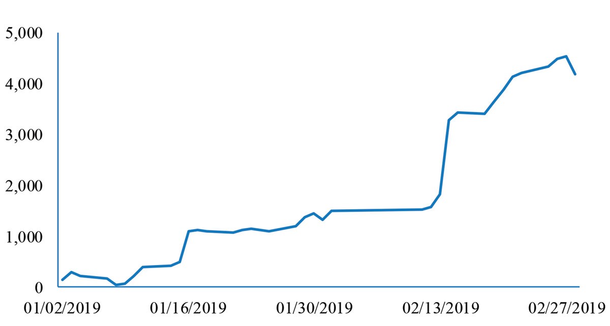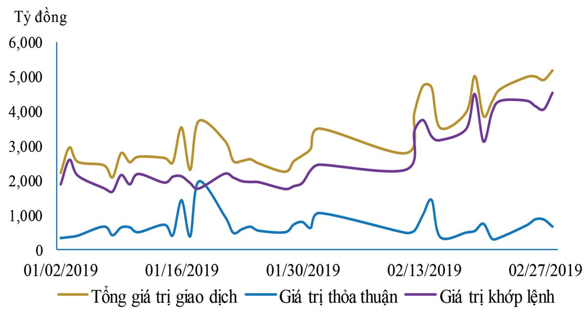 Tháng 2, thanh khoản cải thiện với sự tham gia mạnh của khối ngoại. Về thanh khoản, giai đoạn trước Tết Nguyên đán 2019, giá trị giao dịch bình quân ổn định khoảng 3.000 tỷ đồng/phiên. Sau Tết đến nay, giá trị giao dịch bình quân/phiên tăng lên trên 4.000 tỷ đồng/phiên.