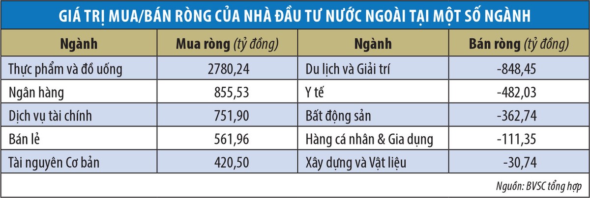 Nhóm ngành được mua ròng mạnh nhất là cổ phiếu thực phẩm và đồ uống, cụ thể là 2 mã MSN và VNM, với giá trị mua lần lượt là 1.905 tỷ đồng và 889 tỷ đồng. Nhóm ngành ngân hàng được mua ròng 851 tỷ đồng, trong đó 2 mã VCB và STB có giá trị mua ròng lần lượt là 731 tỷ đồng và 337 tỷ đồng. Nhóm ngành thép cũng được mua ròng mạnh, cụ thể, HPG được mua ròng 417 tỷ đồng.