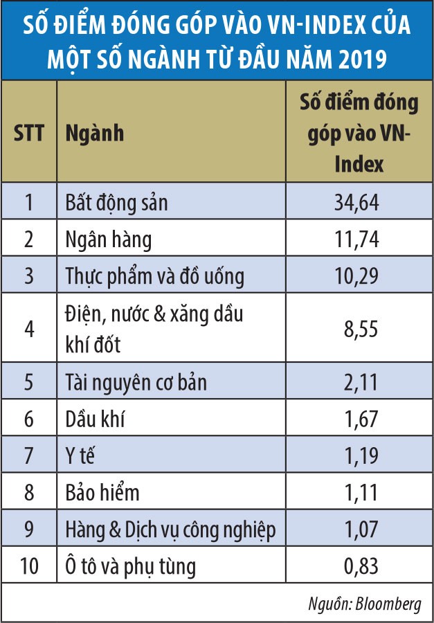 Tính từ đầu năm, các cổ phiếu bất động sản và ngân hàng ảnh hưởng lớn tới chỉ số VN-Index.