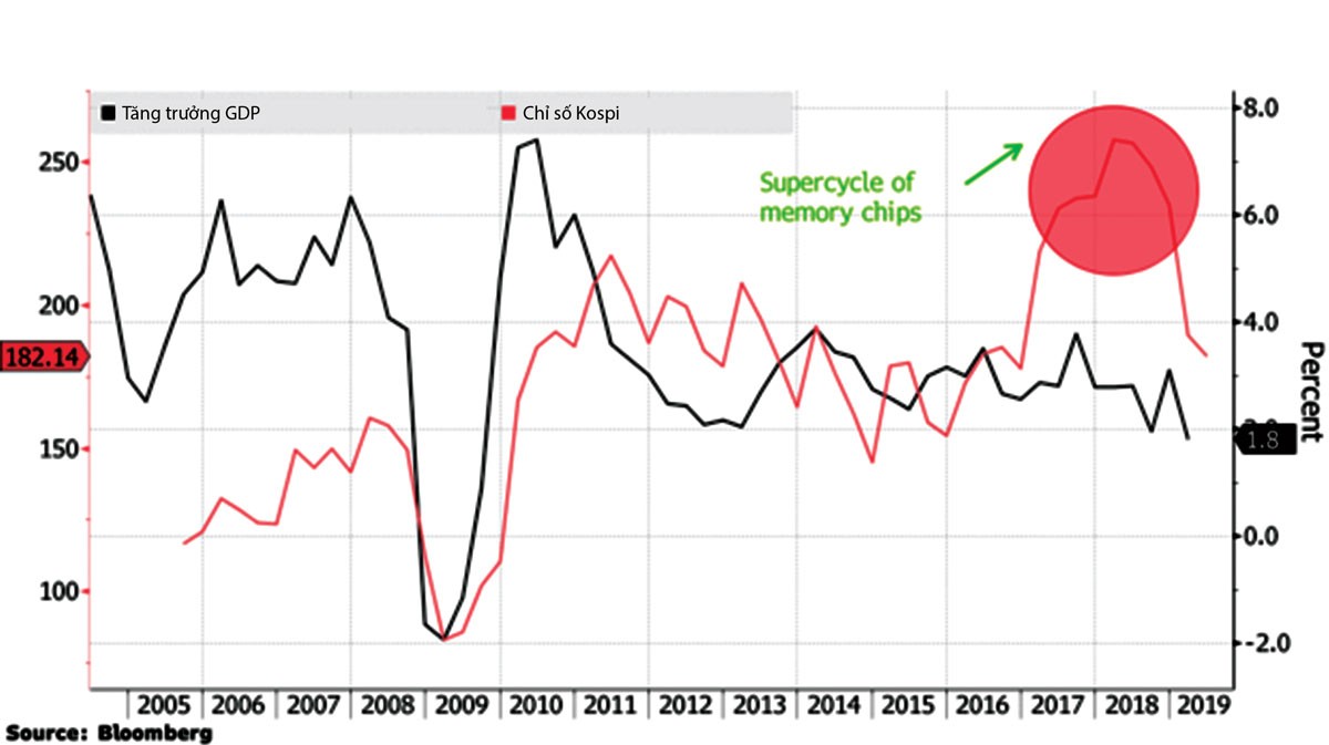 Diễn biến tăng trưởng GDP và chỉ số Kospi của Hàn Quốc.