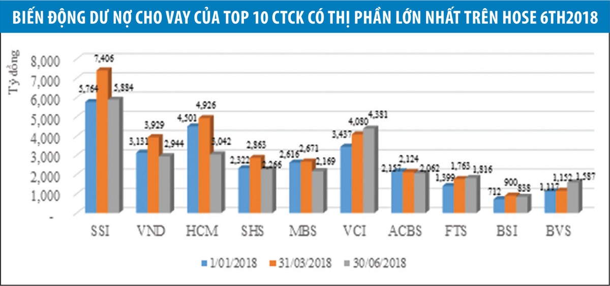 Không ngoài dự báo của các chuyên gia phân tích và các nhà đầu tư, chỉ số chứng khoán giảm mạnh trong quý II đã khiến dư nợ cho vay ký quỹ (margin) tại nhiều công ty chứng khoán giảm mạnh so với giai đoạn thị trường đạt đỉnh vào cuối tháng 3/2018. Tính đến ngày 30/6/2018, tổng dư nợ cho vay tại 10 công ty có thị phần top đầu trên HOSE là 26.998 tỷ đồng, giảm 15,1% so với cuối quý I.