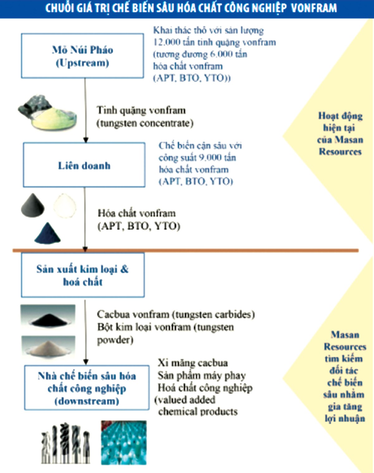 Trong chuỗi giá trị vonfram hiện nay, MSR đã làm chủ được nguồn khoáng sản sơ chế (upstream) với mỏ Núi Pháo lớn nhất thế giới ngoài Trung Quốc và công nghệ chế biến cận sâu (midstream) thông qua sở hữu công nghệ của HCS.