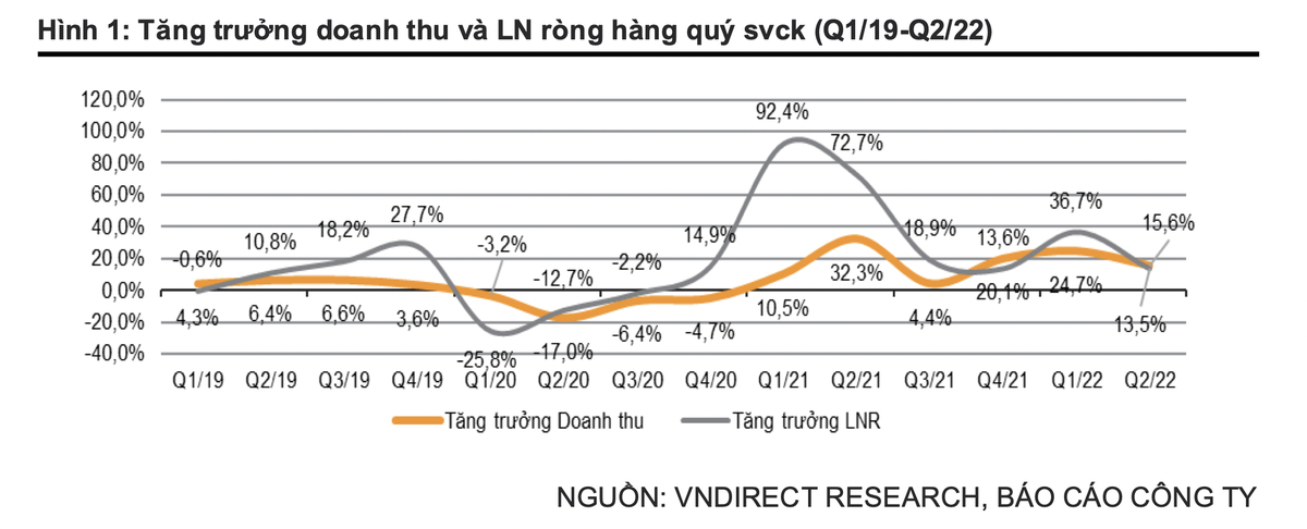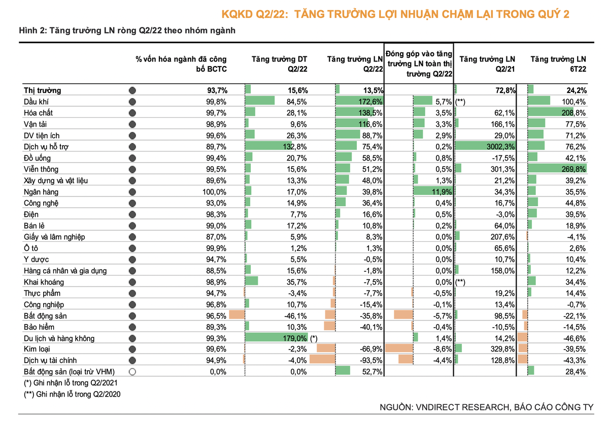 Trong 6 tháng 2022, lợi nhuận ròng toàn thị trường tăng trưởng 24,2% so với cùng kỳ; theo sát với mức dự phóng 23% so với cùng kỳ cho cả năm 2022 của VNDirect.