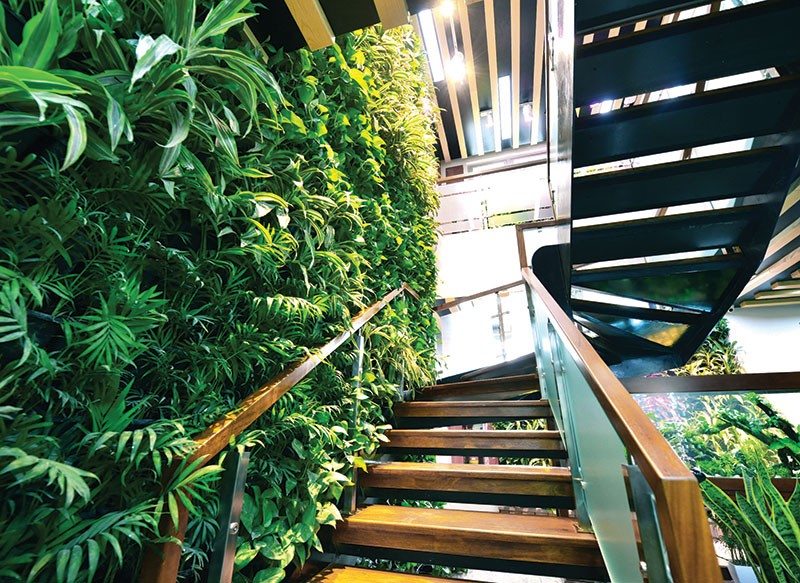 Chính vì thế, ban lãnh đạo tập đoàn này đã xây dựng không gian xanh theo hướng mở, từ hệ thống cây xanh, tới tường, cửa sổ để mọi người cảm thấy luôn "tươi tốt" mỗi khi bắt đầu vào làm việc. Đó có thể là những mảng tường vạn niên thanh, trúc nhật… luôn tươi tốt nhờ được chăm sóc khoa học hàng ngày bằng hệ thống tưới nước nhỏ giọt tự động lắp đồng bộ trên toàn tòa nhà. Tinh tế hơn, ở ngay sát cửa sổ là những chậu cây có thể xoay chuyển theo hướng nắng để giảm bớt cường độ ánh sáng cho căn phòng những giờ cao điểm.