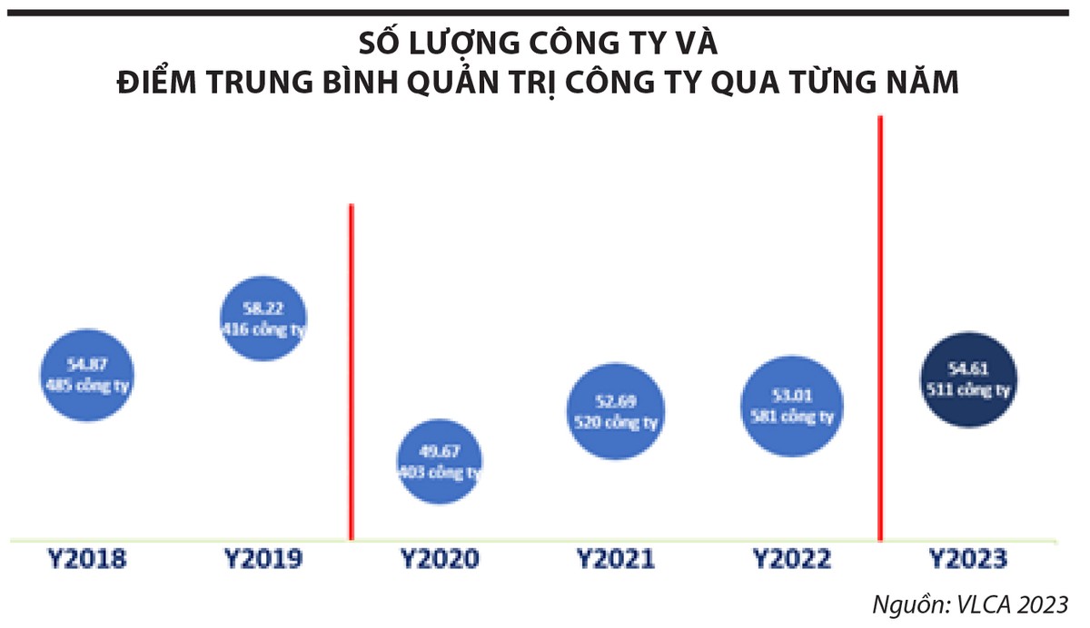 Theo kết quả đánh giá năm 2023, điểm quản trị công ty của các doanh nghiệp có sự biến động đáng kể so với năm trước, chủ yếu do sự bổ sung của các tiêu chí liên quan đến phát triển bền vững và bền bỉ, các khía cạnh khác không có sự khác biệt nhiều so với năm 2022.