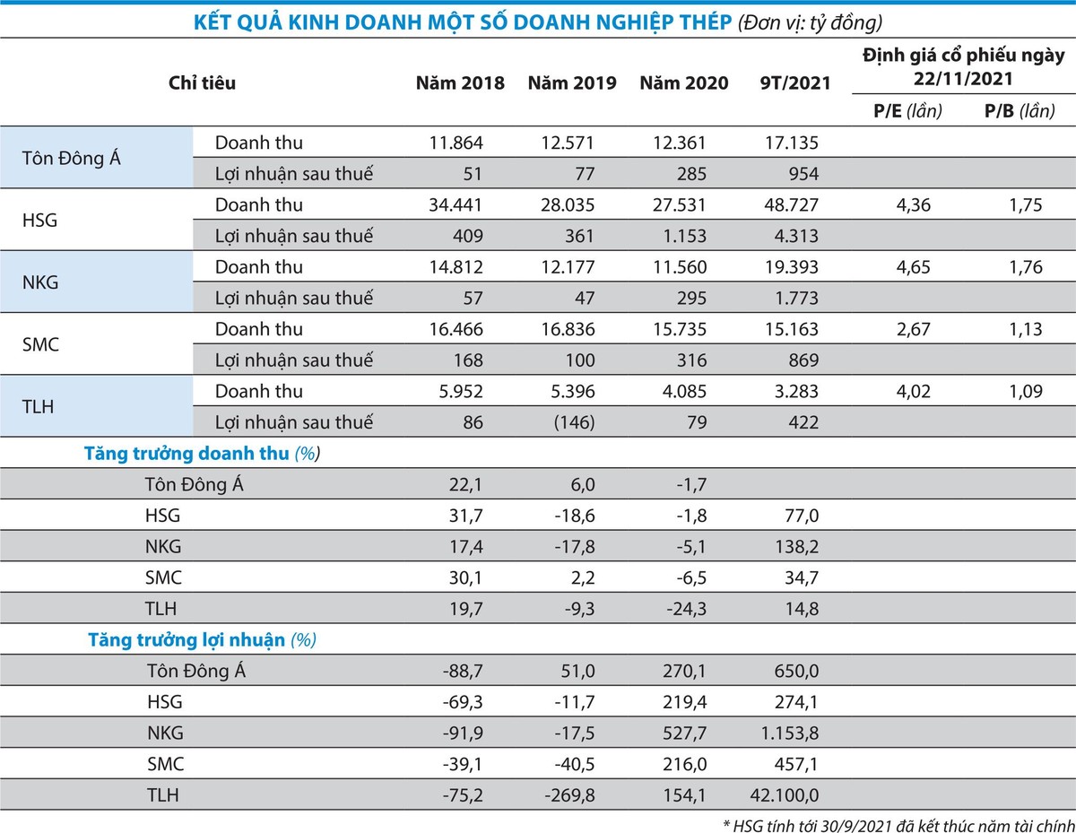 Đặc biệt, trong 9 tháng đầu năm 2021, Công ty cổ phần Tập đoàn Thép Tiến Lên (TLH) tăng 594,3 tỷ đồng tồn kho, lên 2.237,5 tỷ đồng, chiếm 65,3% tổng tài sản; Công ty cổ phần Đầu tư Thương mại SMC (SMC) tăng 1.665,3 tỷ đồng tồn kho, lên 3.469,2 tỷ đồng, chiếm 39,3% tổng tài sản; Công ty cổ phần Thép Nam Kim (NKG) tăng 4.767,2 tỷ đồng tồn kho, lên 7.138,3 tỷ đồng, chiếm 45,2% tổng tài sản; Công ty cổ phần Tập đoàn Hoa Sen (HSG) trong niên độ kế toán 2020-2021 (1/10/2020 - 30/9/2021) tăng 6.832,4 tỷ đồng tồn kho, lên 12.356,2 tỷ đồng, chiếm 46,4% tổng tài sản.