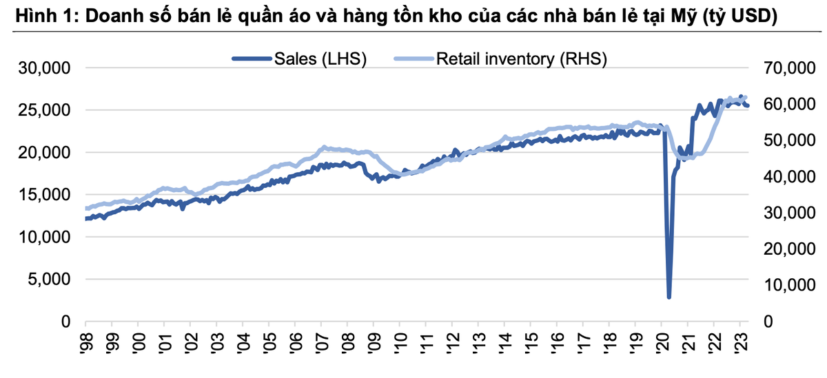 Vietcap cũng lo ngại nhu cầu của người tiêu dùng cuối năm vẫn yếu. Trong 2 đợt suy thoái gần nhất ở Mỹ (ngoại trừ Covid-19) doanh số bán lẻ quần áo hàng tháng của quốc gia này đi ngang hoặc giảm trong 2 năm. Trong khi đó, kể từ giữa 2022, doanh số này chưa giảm đáng kể.