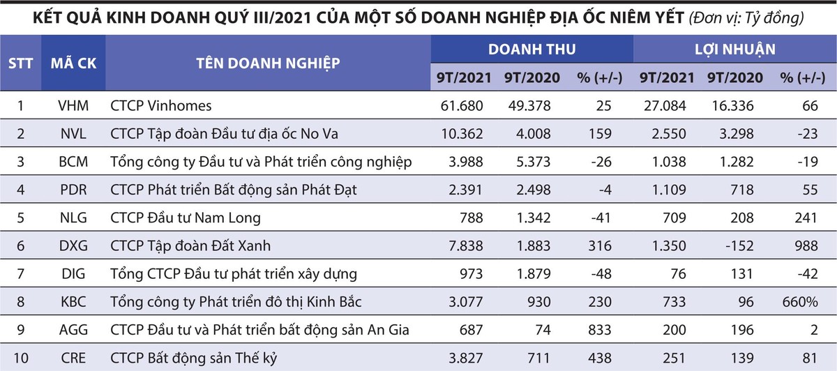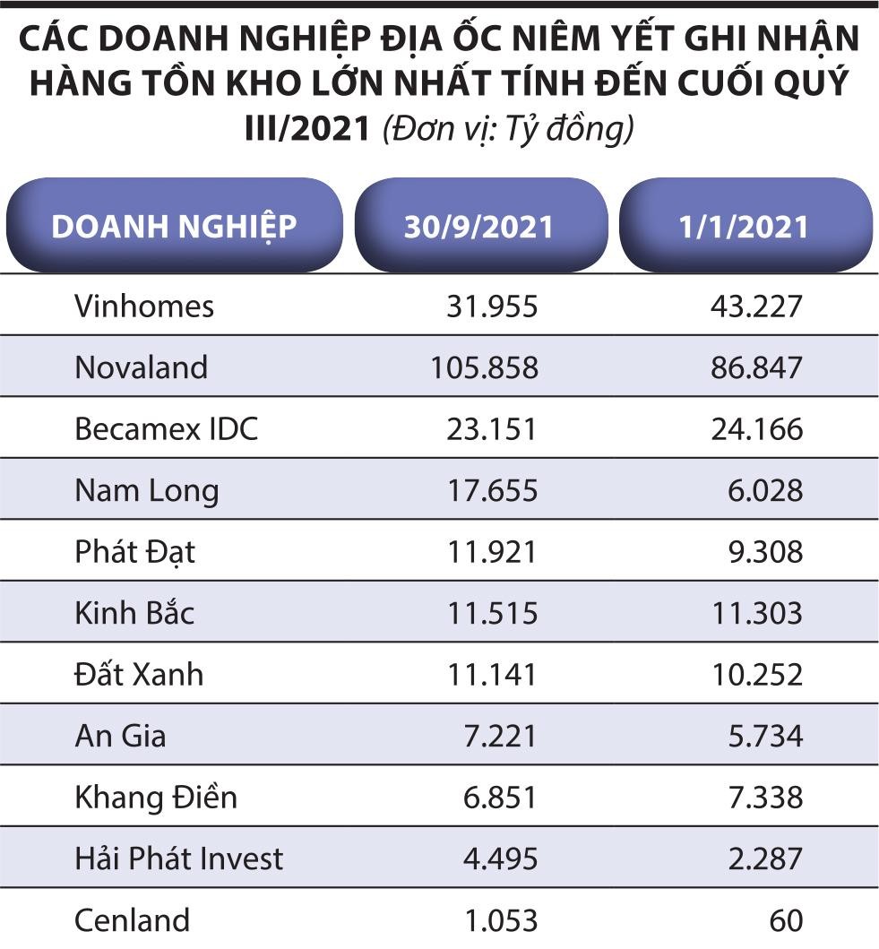 Đồng quan điểm, ông Đỗ Bảo Ngọc, Phó tổng giám đốc Công ty Chứng khoán Kiến Thiết Việt Nam dẫn chứng, phần lớn doanh nghiệp bất động sản đều ghi nhận giá trị hàng tồn kho tăng mạnh trong quý III/2021, khi đây là thời điểm phải thực hiện giãn cách xã hội kéo dài để ngăn ngừa dịch bệnh Covid-19 lây lan mạnh, dẫn tới các hoạt động kinh doanh bị ngưng trệ. Một số doanh nghiệp triển khai bán hàng online, nhưng khó có thể đạt hiệu quả cao vì nhà đất là tài sản giá trị, người mua cần được “mắt thấy, tay sờ” trước khi xuống tiền.