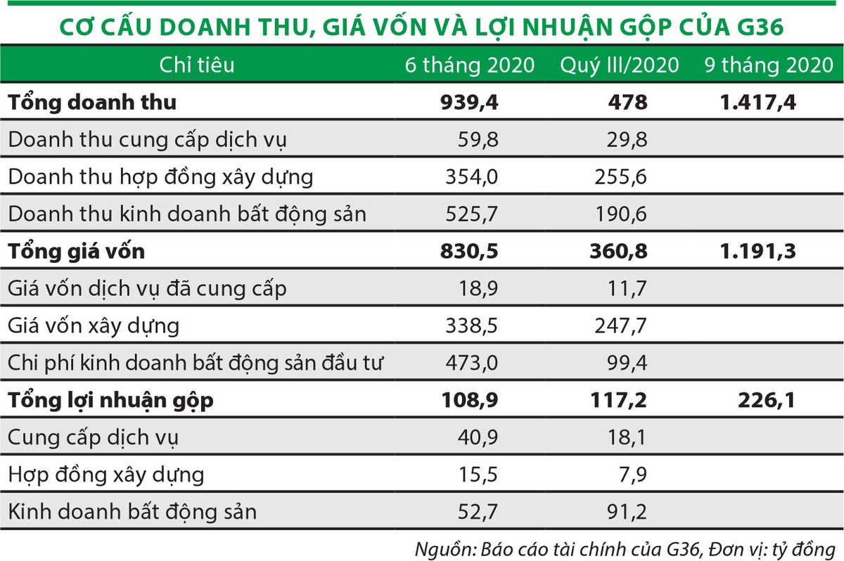 Được biết, năm 2018, G36 ghi nhận lợi nhuận gộp mảng bất động sản 32,5 tỷ đồng, chiếm 13,6% tổng lợi nhuận gộp; năm 2019 ghi nhận 61,1 tỷ đồng và chiếm 29,7%; 9 tháng đầu năm 2020 là 143,9 tỷ đồng, chiếm 63,6%.