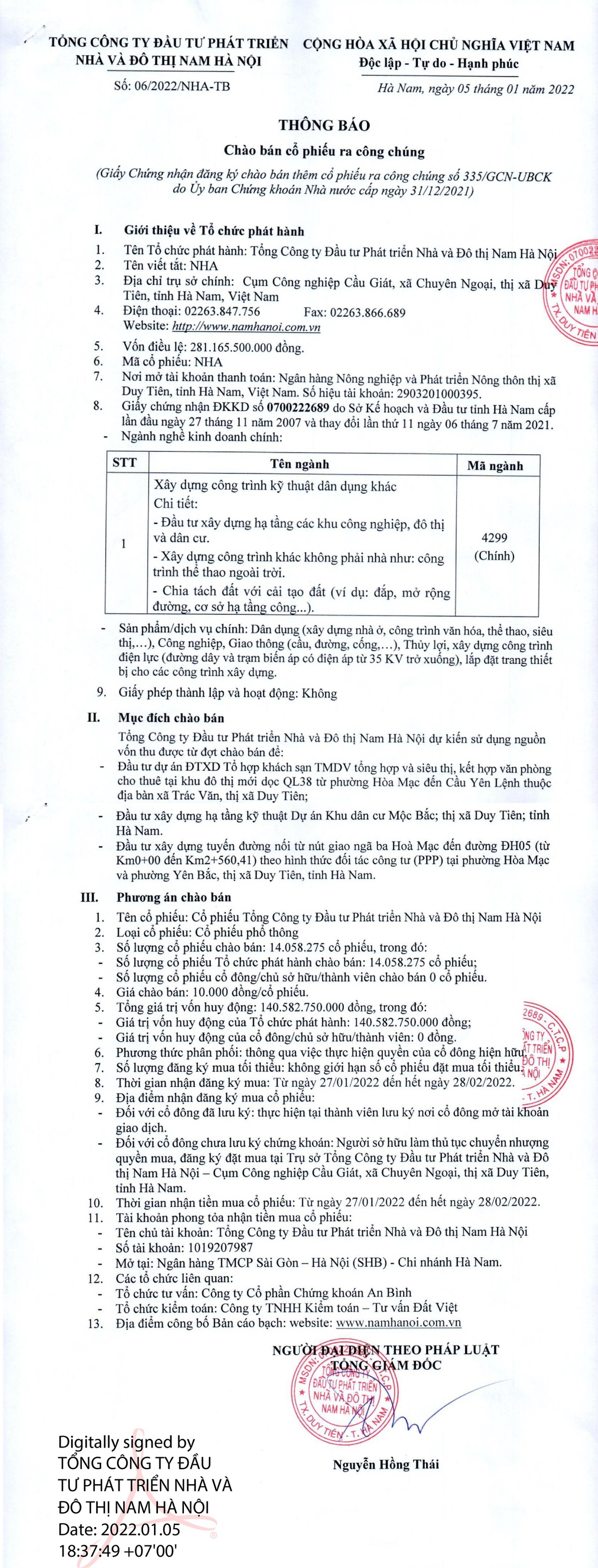 Tin liên quan Ngân hàng TMCP Đông Nam Á (Seabank) thông báo chào bán cổ phiếu ra công chúng 08/01/2022 07:00 Công ty cổ phần Tôn Đông Á thông báo chào bán cổ phiếu ra công chúng 07/01/2022 16:58 CTCP Tập đoàn CIENCO4 (C4G) thông báo chào bán cổ phiếu ra công chúng 05/01/2022 10:49 Từ khóa Tổng công ty Đầu tư Phát triển Nhà và Đô thị Nam Hà Nội