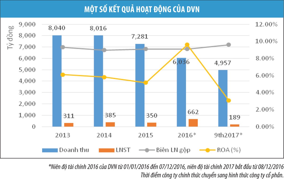 Đến nay, kết quả kinh doanh quý IV và cả năm 2017 chưa được công bố, nhưng theo BCTC quý III/2017 (cho kỳ kế toán bắt đầu từ 8/12/2016 – thời điểm chính thức chuyển sang công ty cổ phần), doanh thu của DVN lũy kế đến 30/9/2017 dù đạt 4.957 tỷ đồng, bằng 81,4% thực hiện năm 2016, nhưng lợi nhuận sau thuế chỉ 189 tỷ đồng, tương đương 28,5% do không có doanh thu tài chính và doanh thu khác đột biến được ghi nhận trong 9 tháng đầu năm. Trong đó, phần dành cho cổ đông công ty mẹ là 170 tỷ đồng. Với kết quả này, tỷ suất sinh lợi trên tổng tài sản (ROS) và vốn chủ sở hữu (ROE) lần lượt chỉ đạt 2,74% và 5,1% sau 9 tháng.