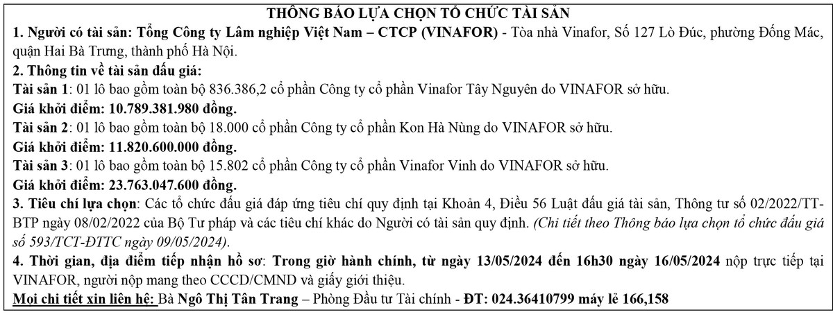 Thông báo lựa chọn Tổ chức bán đấu giá tài sản: Cổ phiếu Công ty CP Vinafor Quảng Trị 10/01/2024 16:15