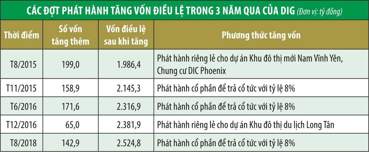 Ngày 14/2/2019, DIG công bố sẽ phát hành gần 19% cổ phiếu cho cổ đông hiện hữu nhằm huy động hơn 619 tỷ đồng để thanh toán tiền giải phóng mặt bằng tại Khu du lịch Long Tân, huyện Nhơn Trạch, tỉnh Đồng Nai hơn 550 tỷ đồng, còn lại thanh toán chi phí đầu tư hạ tầng kỹ thuật và các chi phí khác.