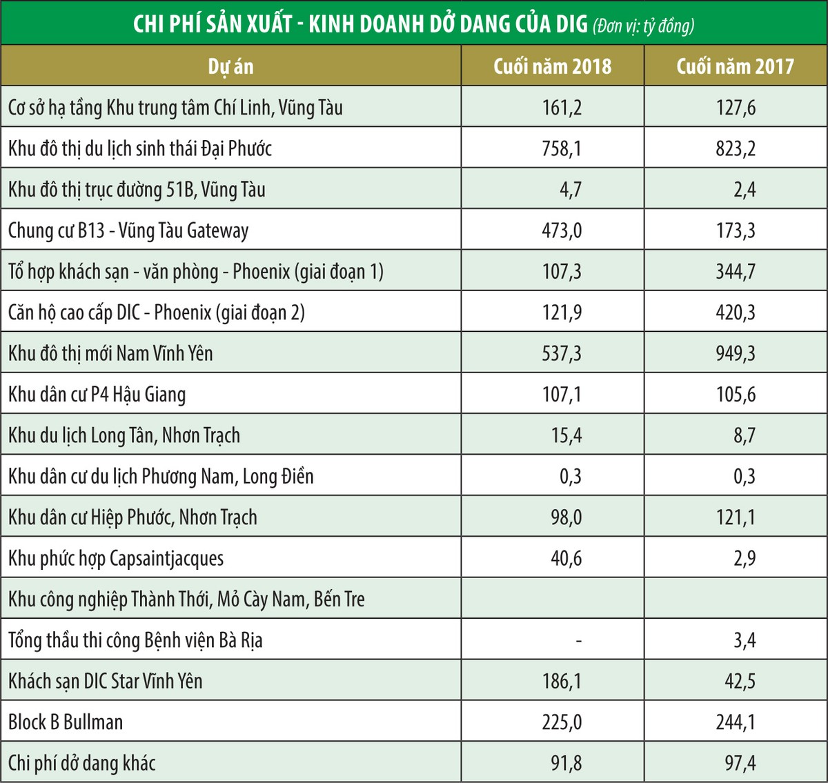 Ngoài phần lãi vốn, nhà đầu tư còn được nhận cổ tức bằng tiền mặt, nhưng không nhiều. Điều này là dễ hiểu nếu nhìn tổng quan các doanh nghiệp bất động sản luôn cần vốn để phát triển dự án mới. Thời điểm cuối năm 2018, DIG đang triển khai nhiều dự án, với tổng chi phí sản xuất - kinh doanh dở dang hơn 2.900 tỷ đồng (xem bảng).