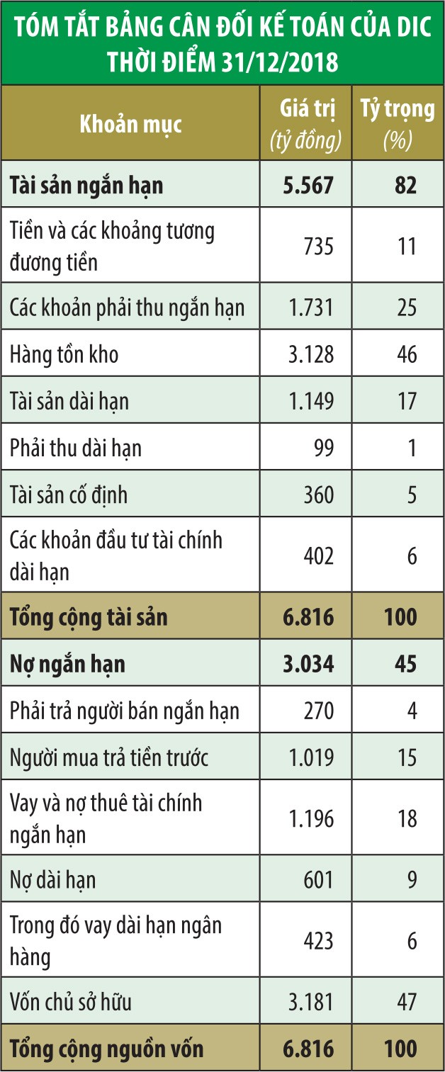 Nhìn tổng quan, DIG không bị mất cân đối tài chính với tài sản tập trung chủ yếu tại các dự án và nợ vay ngân hàng chiếm 24%. Tuy nhiên, Tổng công ty có những khoản đầu tư vào công ty liên kết chưa hiệu quả với số dư hơn 402 tỷ đồng và tại thời điểm cuối năm 2018 đang phải trích lập hơn 25 tỷ đồng.