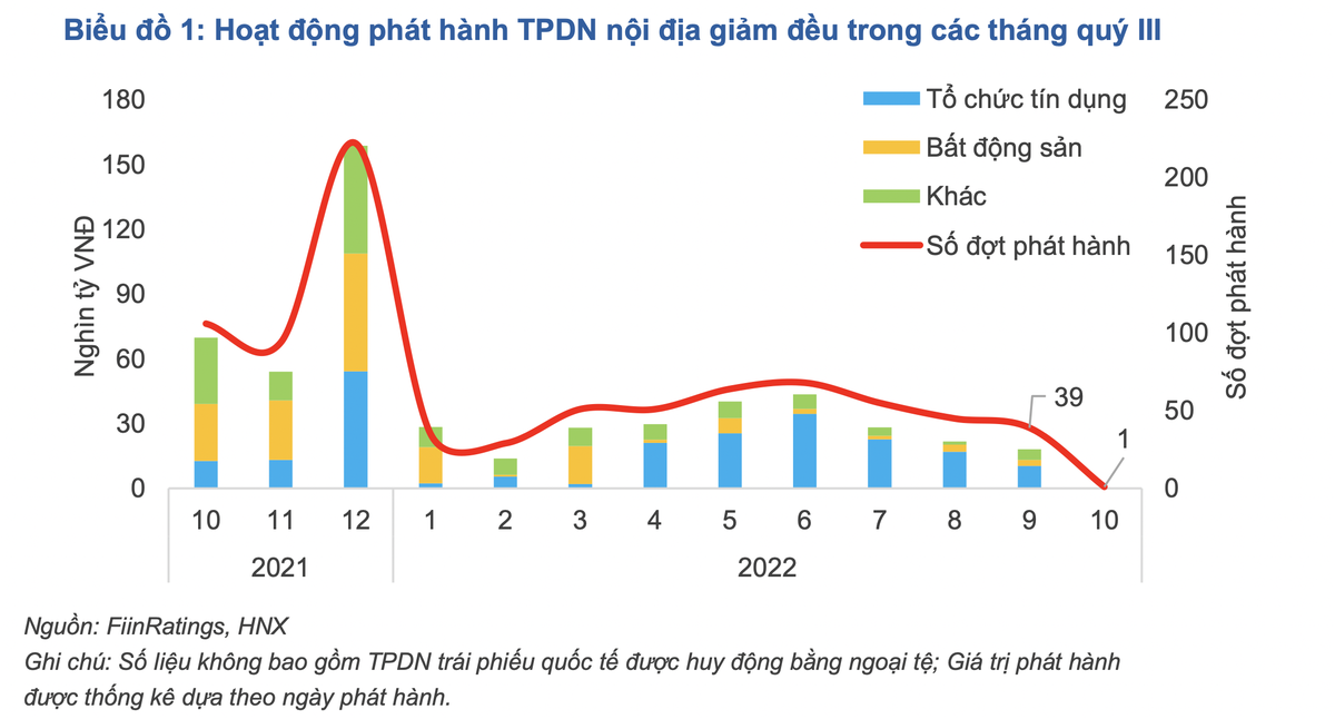Báo cáo trái phiếu tháng 10 của Fiinratings cho biết, tính đến hết tháng 10, giá trị trái phiếu bất động sản đang lưu hành có quy mô 445.000 tỷ đồng, tương ứng gần 34% tổng giá trị trái phiếu riêng lẻ đang lưu hành; gần 50% tổng giá trị trái phiếu của các tổ chức doanh nghiệp phi tài chính (đạt hơn 896.000 tỷ đồng).