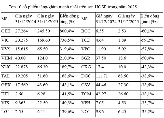 Top 10 cổ phiếu tăng/giảm mạnh năm 2025: Ấn tượng cổ phiếu nhà Vingroup và Gelex