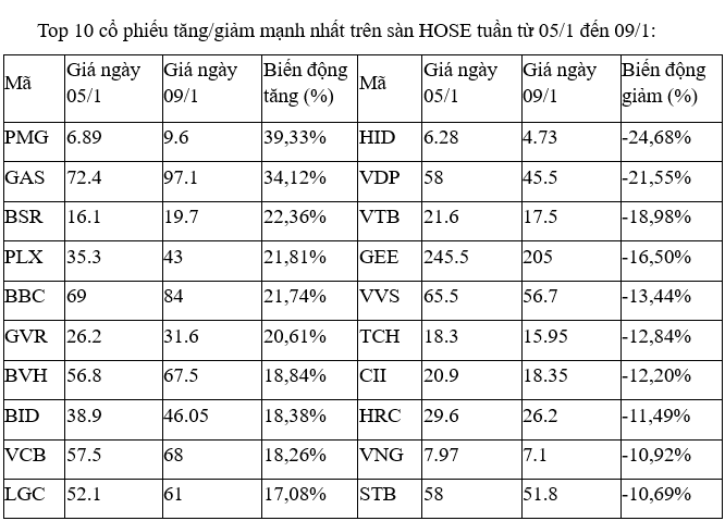 Trên sàn HOSE, nhóm cổ phiếu tạo điểm nhấn là dầu khí khi đóng góp bốn mã PLX, GAS, BSR, PMG và đều là những cổ phiếu dẫn đầu mức tăng trên sàn, ảnh hưởng sau sự kiện tại địa chính trị tại Venezuela.