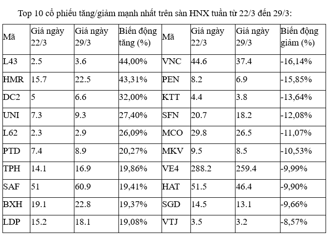 Trong khi đó, cổ phiếu BQB bị chốt lời sau khi tuần trước tăng hơn 40% với 5 phiên tăng kịch trần từ 15/3 đến 22/3.