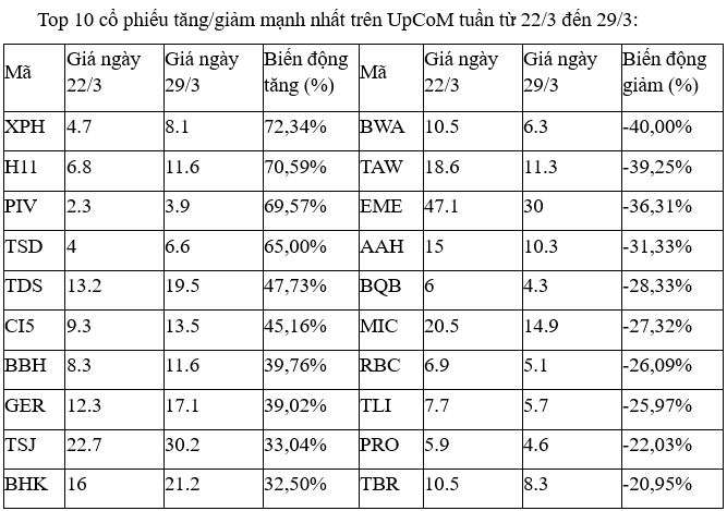 Trên UpCoM, các cổ phiếu H11, PIV tuần này nổi bật với liên tiếp những phiên tăng kịch trần, dù thanh khoản chỉ vài chục nghìn đơn vị khớp lệnh/phiên.