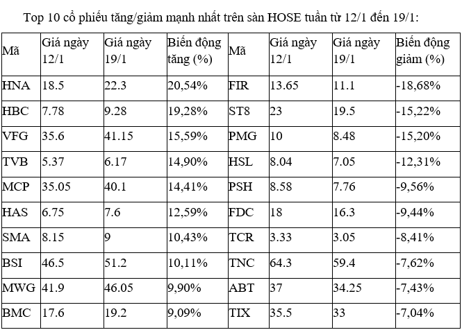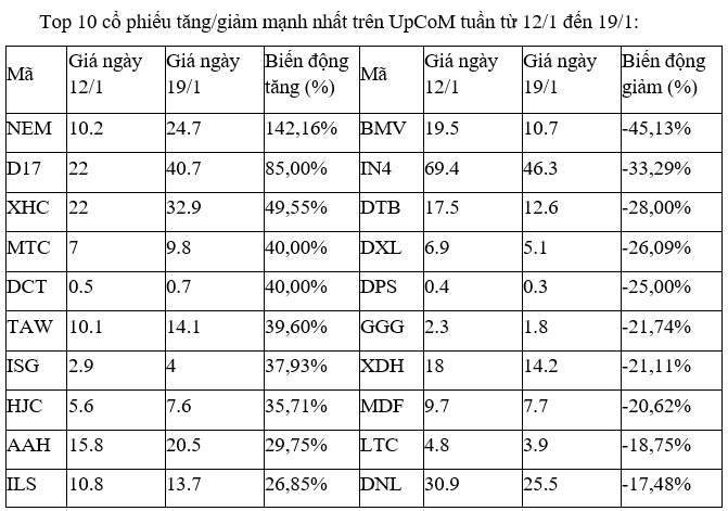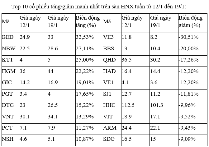 Trên sàn HNX, nhóm cổ phiếu tăng, giảm mạnh nhất tuần này ít có diễn biến đáng chú ý nào đáng kể khi đa phần giao dịch ảm đạm với thanh khoản thấp.