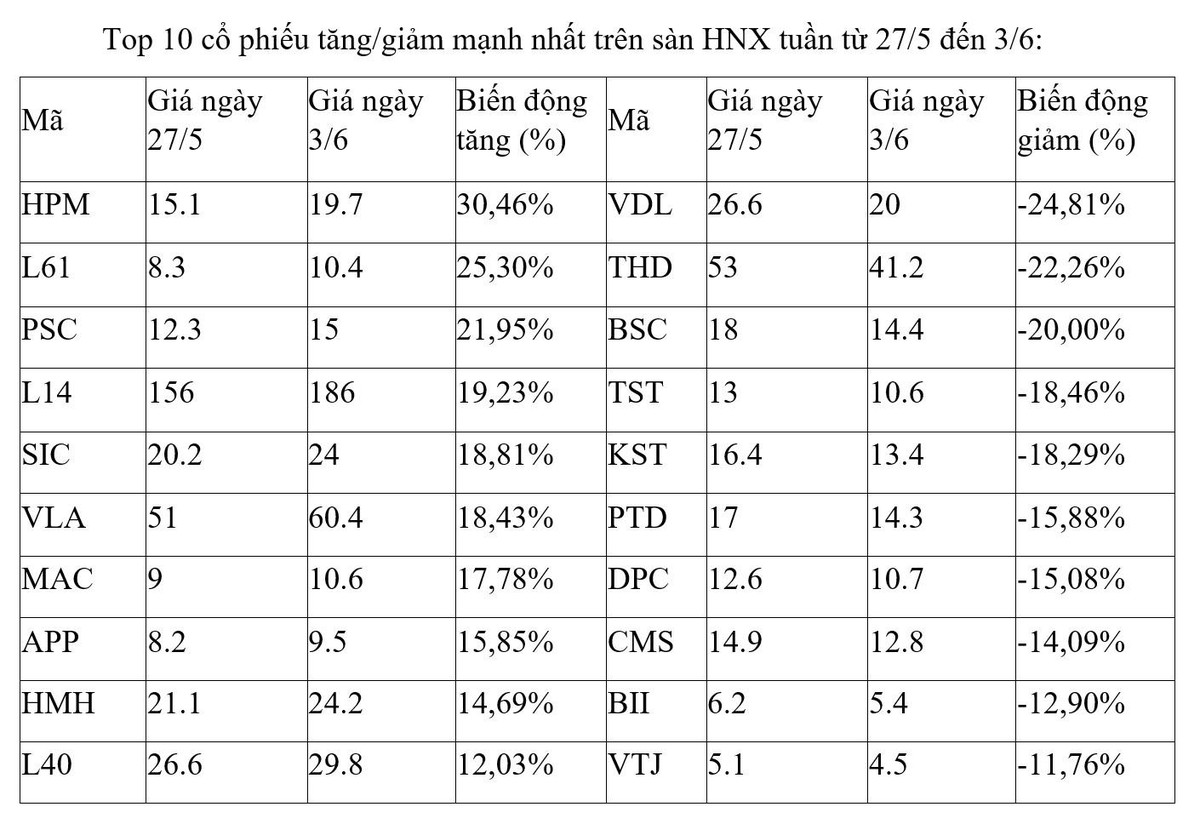 HNX-Index giảm 0,69 điểm (-0,22%), xuống 310,48 điểm. Giá trị giao dịch trên HNX tăng 16% so với tuần trước đó với 10.253 tỷ đồng, khối lượng giao dịch tăng 3,7% lên 420 triệu cổ phiếu.