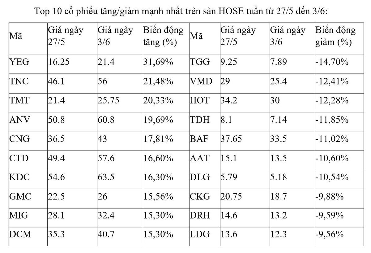 Trên sàn HOSE, ở nhóm cổ phiếu tăng mạnh nhất đáng chú ý có YEG, với cả 5 phiên đều tăng, trong đó có 3 phiên tăng kịch trần liên tiếp từ 30/5 đến 01/6.