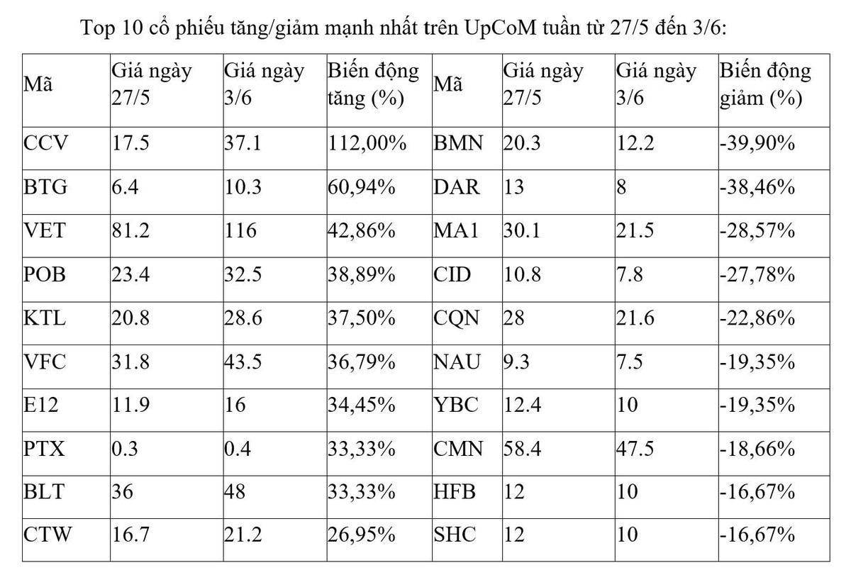 Trên UpCoM, cổ phiếu CCV của CTCP Tư vấn Xây dựng Công nghiệp và Đô thị Việt Nam có mức tăng vượt trội. Nhưng giao dịch ảm đạm, với 4 phiên có giao dịch thì chỉ có 100 đơn vị khớp lệnh/phiên.