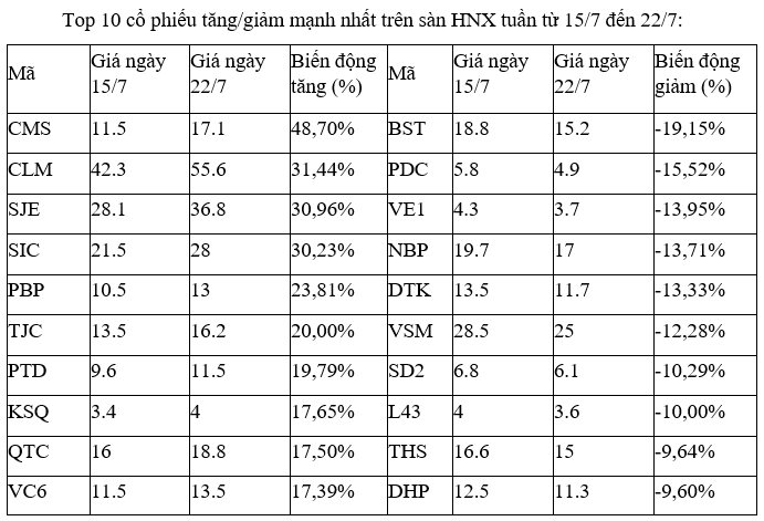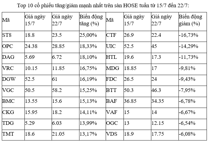 Trên sàn HOSE, cổ phiếu tăng mạnh nhất là ST8, với cả 5 phiên đều tăng, trong đó, có hai phiên tăng trần ngày 18 và 22/7. Thanh khoản có sự gia tăng đáng kể so với thời gian trước đó. Thông tin mới liên quan đến ST8 là việc ngày 28/7 tới đây sẽ chốt danh sách cổ đông tạm ứng cổ tức đợt 1 năm 2022 bằng tiền mặt lên tới 85%.