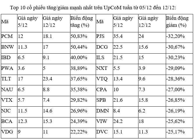 Trên UpCoM tuần qua, các cổ phiếu biến động mạnh nhất đều chỉ ghi nhận mức thanh khoản thấp. Ngay cả cổ phiếu PCM và BNW dù có tuần thứ hai liên tiếp tăng mạnh cũng chỉ vài nghìn cổ phiếu khớp lệnh trung bình/phiên. Tuần trước PCM tăng hơn 80%, còn BNW nhích gần 40%.